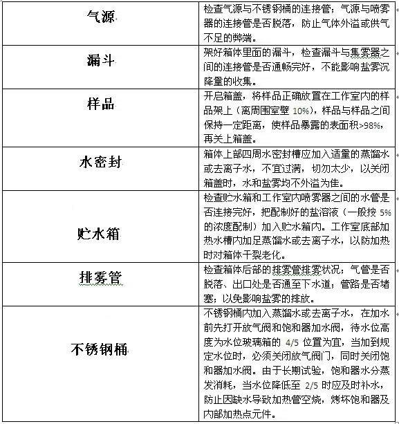 我們都知道,初次使用鹽霧試驗箱有很多講究,更是要做好十足的準(zhǔn)備工作。那么,究竟在啟動鹽霧試驗箱前我們要注意哪些事項,如何做好充足的準(zhǔn)備?下表是小編整理的關(guān)于鹽霧試驗箱啟動前需做的準(zhǔn)備工作,感興趣的朋友不妨一起來看看吧。