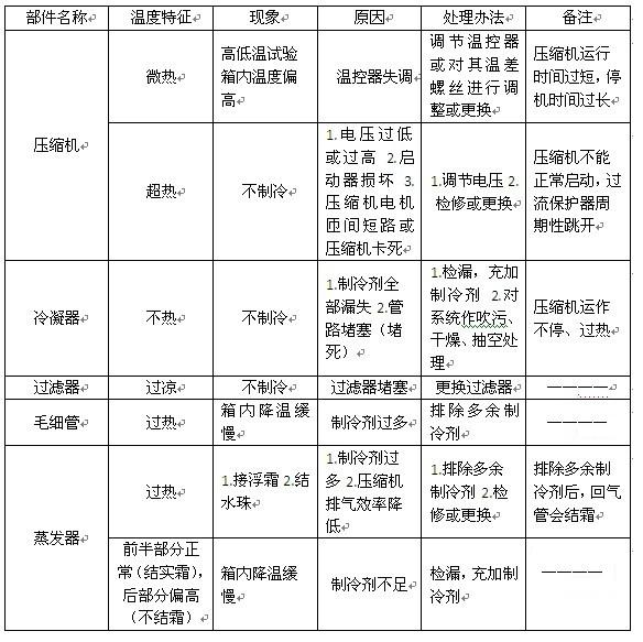 眾所周知,溫度是表示物體的冷熱程度的物理量,是制冷工程的一個(gè)重要的技術(shù)參數(shù)。高低溫試驗(yàn)箱的主要部件是:壓縮機(jī)、冷凝器、過濾器、毛細(xì)管、蒸發(fā)器等,也就是說,他們的工作溫度特征反映了整個(gè)制冷系統(tǒng)的運(yùn)行狀況。我們?cè)谂袛?strong>高低溫試驗(yàn)箱是否存在故障時(shí),最行之有效的方法就是用手去摸各部件的表面溫度。然而,他們的溫度特征怎樣才算正常,請(qǐng)看下表。