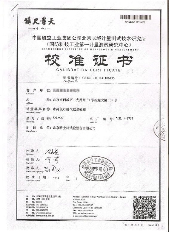 氙燈老化試驗箱校準(zhǔn)證書模板下載—北京長城計量所