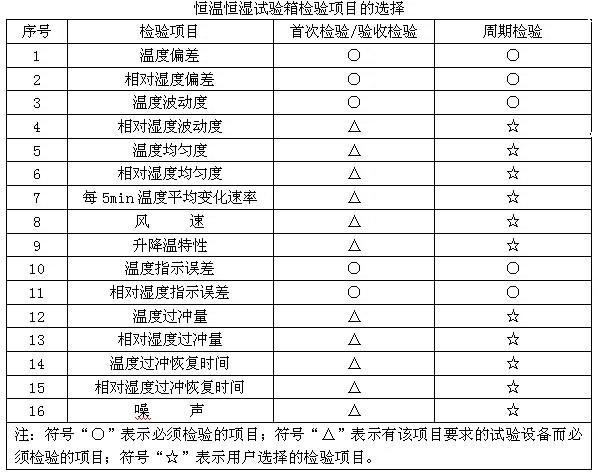 恒溫恒濕試驗(yàn)箱首次檢驗(yàn)/驗(yàn)收檢驗(yàn)和周期檢驗(yàn)時,若無其他規(guī)定,按下表選擇檢驗(yàn)項(xiàng)目。