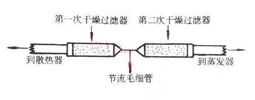 恒溫恒濕試驗箱制冷系統(tǒng)在檢修時,由于操作工藝不嚴,往往會造成制冷系統(tǒng)中的水分不能處理干凈或系統(tǒng)中的空氣排不干凈。這些水分在恒溫恒濕試驗箱制冷系統(tǒng)中會與制冷劑、油反應生成氫氟酸和鹽酸,腐蝕各部件、管道和冷凍油,尤其對鋁制平板式蒸發(fā)器腐蝕更嚴重。為了徹底解決這一問題,完全清除制冷系統(tǒng)中殘余水分,下面為大家介紹兩次過濾法,具體做法見下圖,在蒸發(fā)器與毛細管之間增加一個帶有干燥劑的過濾器。