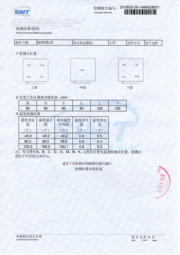 高低溫試驗箱在首次投入使用前,應對可反映設備性能的相關參數(shù)進行詳細確認及測試,在日常使用中則應依據(jù)所使用的試驗方法進行對試驗參數(shù)的要求,需確認其性能是否滿足試驗參數(shù)的要求。更多的用戶會選擇由第三方檢測機構進行檢測,并出廠檢測報告,如下: